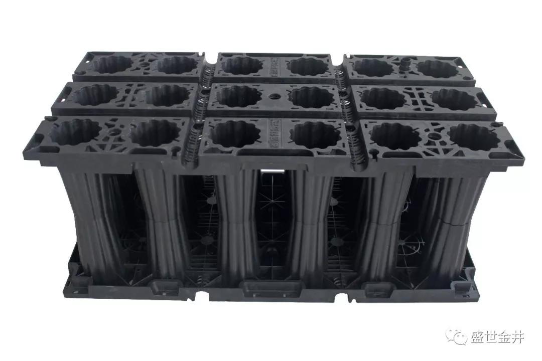盛世金井雨水收集模塊是一種PP塑料,可埋于地下,用以收集雨水,再利用雨水。雨水蓄水模塊由相同規(guī)格尺寸的網(wǎng)格狀平板拼裝成模塊化的箱體,然后將每一個箱體碼放成為連續(xù)的雨水“矩陣”池。因為其網(wǎng)格化透空的結(jié)構(gòu),材料的結(jié)構(gòu)占用空間不到5%,即模塊的蓄水空間達(dá)到95%以上,雨水可以在其中自由交換流動。